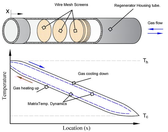 The ideal regenerator can be interpreted as a thermodynamic object that receives the gas during the heating phase with low temperature Tc and releases it with high temperature Th. After the flow direction is reversed, the gas enters with temperature Th and leaves with Tc. In practice, the ideal regenerator case is impossible to achieve, where maintaining constant inlet/outlet temperature would need infinitely slow operation, or an infinite heat transfer coefficient, and/or a great heat transfer area. Furthermore, the heat capacity of the fluid and the matrix should be respectively zero and infinity. Moreover, the absence of a pressure drop would require a frictionless flow, while the absence of void volume would prevent the provision of flow passages through the matrix for the fluid to traverse [14].