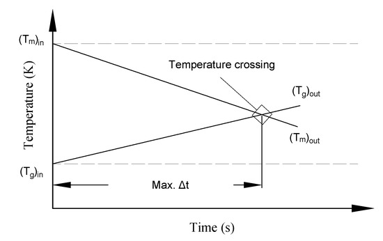 From a mathematical point of view, the maximum time interval , for each successive nodal calculation, is achieved when the output matrix and fluid temperatures are equal. If the outlet temperatures go beyond that, the crossing of the outlet temperatures causes a sign-reversal of the inlet temperature difference for the next calculation cycle and hence causes a divergence of the numerical solution. To prevent this crossover and thus divergence, the model must either set the time interval to a minimal value or introduce a larger number of spatial nodes. Figure 3 illustrates the convergence criteria during the cooling period. The previous two conditions are applied to Equations (1) and (2) to deduce the reduced convergence formula: .