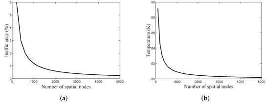 The number of spatial nodes is also significant in defining the accuracy of the computed variables. As the number of spatial nodes increases, the final outlet gas temperature during the heating period approaches the inlet gas temperature during the cooling period, thus decreasing inefficiency (Ie), as suggested by Equation (5). Figure 4a shows the effect of increasing the number of spatial nodes on the accuracy of the inefficiency as a calculated variable, and Figure 4b shows the effect of the number of spatial nodes on the final outlet gas temperature. It shows that the proposed finite difference numerical model requires at least 4000 nodes to achieve tolerable accuracy if is set to 200.