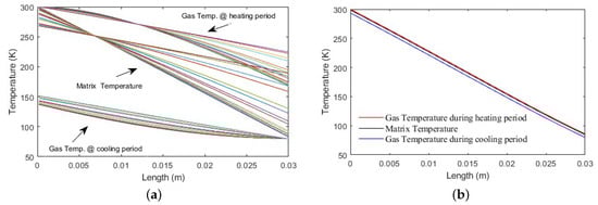 Figure 6a shows the gas and matrix temperature profiles during heating and cooling periods. It can be noticed that the temperature of the matrix material was increasing for all spatial elements during the heating period while the hot gas temperature dropped gradually as it crossed the regenerator, causing all the matrix elements to heat up. The cold gas was heated up as it passed the matrix, resulting in cooling the matrix. Figure 6b shows the algorithm after it converged and settled to a solution where the difference in temperature between the matrix and gas was minimal; this happened after increasing the number of time and/or space nodes, as described previously in Section 2.2.