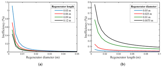 The dimensional and parametric analyses are of central importance for any efficient regenerator design. Figure 7a shows the relation between the regenerator diameter and its inefficiency (Ie), for several lengths, while Figure 7b illustrates the relation between the length of the regenerator and the inefficiency (Ie) for several regenerator diameters. These were based on the ideal case interpretation of the thermal interaction between the working gas and the matrix material; hence, it did not consider conduction or viscous losses. Furthermore, it assumed that the thermal properties for both the matrix and the working gas were constant with temperature variation inside the tube.