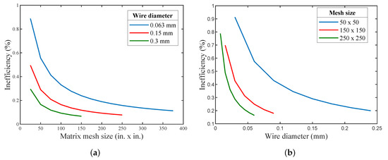 Figure 8b depicts the relation between the inefficiency (Ie) with the mesh screen wire diameter for several mesh sizes. It can be shown that the increase in the wire diameter decreased the inefficiency (Ie), since it decreased the porosity of the mesh screen, which was in turn inversely proportional to the mass of regenerator, hence leading to increasing the total heat transfer area. It is evident from Figure 8 that the regenerator’s inefficiency dropped with the increase in the wire diameter of the regenerator for the same mesh size, and this was also valid for different mesh screen sizes. Note that, as the wire diameter and mesh size increased, the pressure drop increased in the non-ideal case, since the gas free-flow area decreased.