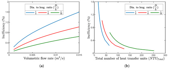 Figure 9a illustrates the relation between the volumetric flow rate on inefficiency for several regenerator diameter to length ratios (). It can be noticed that, for an increased volumetric flow rate, the inefficiency increased due to a decrease in the total number of heat transfer units (NTUTotal), as illustrated in Figure 9b. In order to maintain the inefficiency at the same level for increased flow rates, the matrix total heat transfer area had to be increased, which meant using a longer regenerator tube with a larger diameter. For the previously highlighted case with a volumetric flow rate of 0.001 , NTUTotal of 63, , and , the inefficiency (Ie) was found to be around with 39.8 ≤ Re ≤ 365, where Re is the Reynolds’ number. This inefficiency level would cause a regenerator thermal loss of ∼ 0.39 W, which shows that adequate regenerator performance could still be achieved with such small dimensions.
