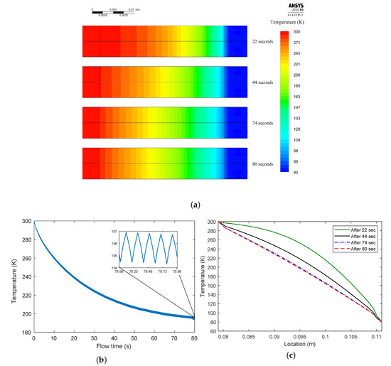 The model assumed that the regenerator temperature was initially at . Figure 10a shows CFD-predicted temperature distributions after four different flow times in the regenerator section. Figure 10b illustrates the regenerator average temperature profile versus flow time, and it shows the temperature dynamics during the heating and cooling periods as the cold and hot gas are flowing in and out of the regenerator. Moreover, it suggests a steady uniform temperature distribution after approximately 80 s in which an average temperature of 195 K was reached. The contour plot in Figure 10a proves this uniform distribution after a flow time of 80 s.