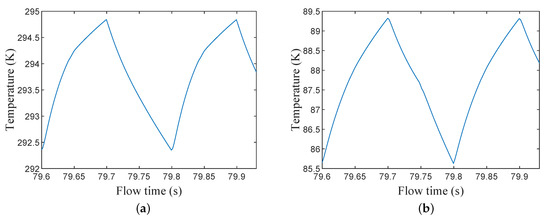 Figure 11a,b show the temperature changes, during the heating and cooling periods, at the hot and cold ends, respectively. If a steady flow was assumed, the inefficiency could be calculated using Equations (5) and (6), and these were found to be 2.5% and 2.3% for the cooling and heating periods, respectively. The inefficiency value from the 2D axisymmetric model agreed with the findings in Figure 8b that decreasing the wire diameter would result in decreasing inefficiency. The 2D model proved that the stainless steel #635 mesh size was a good fit for a filler material for a miniature cryogenic regenerator.