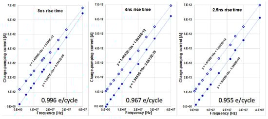 Measured and leakage corrected charge-pumping current as a function of frequency and their corresponding least square fits for three different rise/fall times. The charge per cycle at the bottom is extracted from the slope of the leakage corrected least square fit line, dividing by 1.6022 × 10−19 Coulomb.