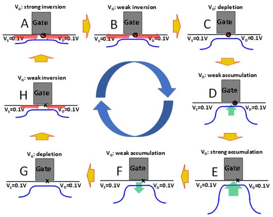 Figure 3 shows the charge-pumping concept in detail: At strong inversion (Figure 3A), the surface potential barrier in the channel (blue curve) is suppressed so that electrons from source and drain flood the channel (red arrows), allowing the empty defect site (x) to capture an electron (red circle). As the gate voltage is reversed toward depletion, the surface potential barrier increases and electrons from the channel flow back out to source and drain as shown in Figure 3B. The electron that was captured by the defect remains as shown in (Figure 3C). As the gate voltage continues to change toward strong accumulation (Figure 3E), holes from the substrate flood the channel. The captured electron at the defect site can recombine with a hole (the red circle disappears). As the gate voltage changes back toward depletion, all the holes flow back to the substrate, except the one that recombined with the electron. The empty defect is now ready to capture an electron the next time the channel is flooded with electrons (Figure 3A) and the net result of one charge-pumping cycle is to move one electron from the source and drain to the substrate (as a missing hole).