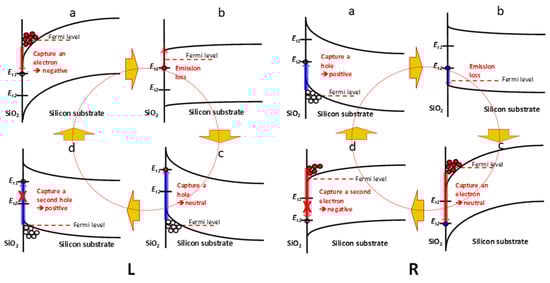 Band diagram of the Si/SiO2 interface showing the two energy levels, Et1 and Et2, of a dangling bond defect. L: CP cycle involving only the sp3-like accepter energy state Et1. (a) At strong inversion, the Et1 state captures an electron to become negatively charged; (b) sweeping through depletion toward accumulation provides a small time-energy window for emission loss; (c) at strong accumulation, the Et1 state captures a hole to become neutral again; (d) while still accumulated, the neutral Et1 state does not have enough time to convert to Et2 state and cannot capture another hole to become positively charged. R: CP cycle involving only the sp2-like donor energy state Et2. (a) At strong accumulation, the Et2 state captures a hole to become positively charged; (b) sweeping through depletion toward inversion provides a small time-energy window for emission loss; (c) at strong inversion, the Et2 state captures an electron to become neutral again; (d) while still inverted, the neutral Et2 state does not have enough time to convert to Et1 state and cannot capture another electron to become negatively charged.