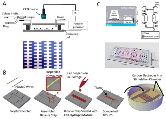 A heart chip system for drug toxicity testing. (A) Schematic of the first microfluidic devices to CMs anisotropy []. (B) Representative tissues in the Biowire II platform []. (C) Design of the microfluidic device used for integrated heart/cancer-on-a-chip (iHCC) [].