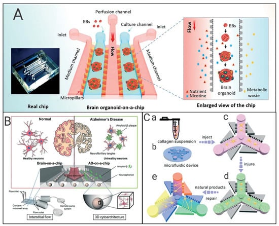 Schematic diagram of the research progress of neural chips. (A) The structure of the human brain organoid-on-a-chip to model prenatal nicotine exposure []. (B) Three-dimensional brain-on-a-chip with an interstitial level of flow and its application as an in vitro model of Alzheimer’s disease []. (C) A 3D microfluidic device to quantify orientational regeneration of injured neurons in AD by natural product concentration gradients [].