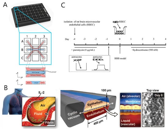 Some other-organ-on-a-chip systems for drug toxicity testing. (A) Schematic representation of the 3-lane OrganoPlate gut-on-a-chip model []. (B) A microengineered model of human pulmonary edema []. (C) Schematic drawing of the preparation of the in vitro blood–brain barrier (BBB) model [].
