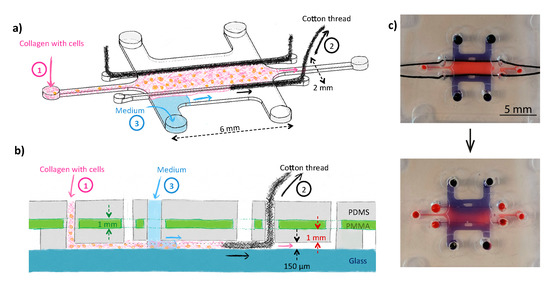 Building up on previously developed technology making use of removable filaments in a microfluidic device to create hydrogel structures [56,57] we first confined our 3D cell-hydrogel construct using Nylon filaments (VARIVAS Fluoro carbon Super tippet 2XN 0.235-mm diameter, Morris, Saitama, Japan) inserted in 200-µm high guiding channels through vertical inlets and outlets before bonding of the device. However, those large filaments were not deformable enough to bend and conform with the sharp angle existing at the inlets and outlets of the guiding channels, which significantly hampered bonding of the device with the glass slide, which was not the case for smaller height channels (80 µm) and thinner Nylon fibers (95-µm diameter) in the original paper introducing this technique. Therefore, we consecutively examined the applicability of more deformable filaments in the form of mercerized cotton threads. Due to their higher compliance, these cotton threads could adapt to the sharp angle between the guiding channel and the vertical inlets, ensuring good bonding of the chips. Next, collagen was successfully injected between the threads without leakage through these multi-filaments: the threads were indeed compressed inside the guiding channels, reducing the presence of inter-fiber spaces, and the commercial mercerization process (an alkaline treatment of the yarns in sodium hydroxide) increased the thread hydrophobicity. However, keeping the cotton threads in contact with the hydrogel for a few tens of minutes would still induce wicking and capillary pumping of the water-phase. Shortly after injection of the collagen (after ca. 2 min), threads were easily pulled out of the chip, following the guiding channel thanks to their lack of shape memory, leaving the partially gelled and more viscous collagen between the two guiding channels. Noteworthy, when using such cotton threads, the device should be thoroughly sterilized with ethanol before use, not to compromise cell viability during the experiments.