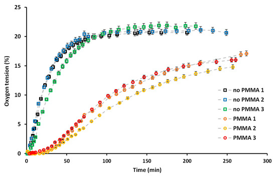Characterization of the oxygen diffusion in the device over time for devices containing a PMMA sheet (circle symbols) or only PDMS (square symbols), for three independent devices for each case on three different days. Data are presented as the oxygen tension as a function of time, this being assessed by monitoring the decrease in the fluorescence intensity of the tris(2,2′-bipyridyl)dichlororuthenium(II) hexahydrate (Ru(BPY)3) oxygen-sensitive probe added in aqueous solution in the device. Data were acquired over a period of more than 4 h, as detailed in the experimental section and analyzed as explained in supplementary material S2.