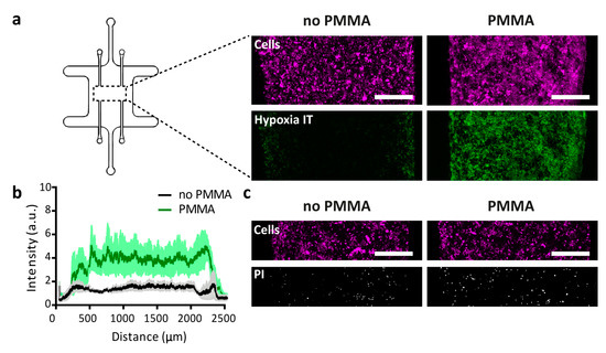 The central compartment of microfluidic devices, with or without PMMA sheet, was loaded with a collagen suspension containing 40 million/mL U-251 MG cells. After 48 h of culture in the device, the hypoxia sensor dye Image-IT was added and the oxygen concentration throughout the device characterized. In line with observations from the devices evaluated in absence of cells, a lower oxygen tension was systematically observed in the devices that contained the PMMA sheet as compared to their counterparts without any PMMA sheet (Figure 3a,b). Under the tested conditions, the induced hypoxia did not evidently increase cell death, as similar overall cell density and low amounts of PI-positive cells were found in devices with and without PMMA sheet. In one slice through the entire device, we counted 321 or 515 PI-positive cells in separate devices without PMMA after 48 h of culture, vs. 450 and 577 PI-positive cells in separate devices with the PMMA sheet. In either device, the large majority of cells remained PI negative (Figure 3c,d). Noteworthy, a steep oxygen gradient was found over the first few hundred microns of the 3D culture at either side, with the largest part in the middle of the 2 mm-wide tumor compartment exhibiting similar oxygen levels. These observations are in line with experimental data on oxygen tension drops away from blood vessels measured in vivo in tumors, which showed a very rapid drop in the first 200 μm [60].