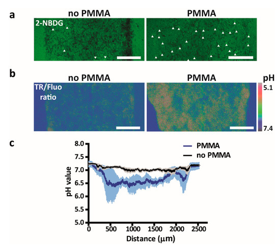 Investigation of the metabolic switch of U-251 MG cells cultured in the tumor-on-a-chip platform. (a) 2-NBDG uptake by U-251 MG cells cultured in devices with or without a PMMA sheet. Arrows indicate cells with enhanced 2-NBDG uptake. (b) Representative image of the fluorescence ratio of TAMRA and fluorescein (TR/Fluo) of a dual-labeled dextran as a pH sensor in microfluidic devices loaded with U-251 MG cells with or without a PMMA sheet. Scale bars represent 500 μm. (c) Quantified pH values in the device based on the ratio of the intensities of the two dyes (TR/Fluo) of the dual-labeled dextran for devices as illustrated in panel b. Lines depict averages at distinct positions in the devices and the shaded areas indicate the s.e.m.