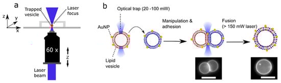 There have been several recent studies on techniques to fuse Giant Unilamellar Vesicles (GUVs; enclosed cell-sized bilayer spheres) while using optical traps and membrane-bound gold nanoparticles (AuNP) [12,19,20]. The underlying mechanism behind this process is AuNP absorbance at the laser focus, followed by heat dissipation, local temperature elevation (>100 °C) in a region of characteristic size that is equal to the NP diameter [21], membrane expansion, and then fusion [19,20]. Similar optical tweezing technologies have recently been used to controllably manipulate co-existing membrane domains (analogues of cellular lipid rafts) within the membrane [22].