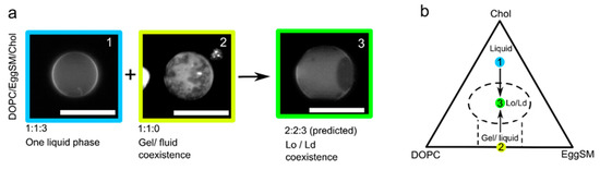 - Bezlyepkina, N.; Gracià, R.; Shchelokovskyy, P.; Lipowsky, R.; Dimova, R. Phase diagram and tie-line determination for the ternary mixture DOPC/eSM/cholesterol. Biophys. J. 2013, 104, 1456–1464. [Google Scholar] [CrossRef]