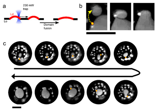 Controlled manipulation of membrane domains using optical traps. (a) Schematic showing manipulation of liquid-disordered (Ld) domains within a liquid-ordered (Lo) matrix to induce domain fusion. (b) Fluorescence image of a portion of a vesicle membrane showing an Ld domain being dragged by an optical trap (yellow dot and arrow) towards an adjacent domain to induce fusion. Lipid composition: DOPC/EggSM/Chol 1:1:1. (c) Time-course image showing eight sequential fusion events that were user-defined through domain manipulation with an optical trap (yellow circle). Scale bars = 5 µm.