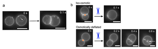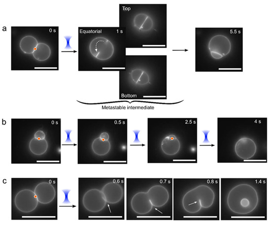 Finally, the fine spatiotemporal control that is associated with the use of laser has meant that we were able to observe a repertoire of membrane transformations, including: (i) the formation of large open membrane intermediate structures that appear to be metastable; (ii) the opening/resealing of transient pores (<1 s); and, (iii) the generation of internal daughter vesicles post-fusion. Many of these could be repurposed in a synthetic biology context. When coupled with microfluidic [30] and related technologies [31,32], it could be used to sculpt new cell-mimetic motifs (e.g., synthetic nuclei), replicate cellular processes (e.g., endocytosis), and gain insight into cell membrane biophysics in a model environment. Taken together, these results serve as a feasibility roadmap to guide future detailed studies and exploitation of laser-assisted membrane manipulation technologies.