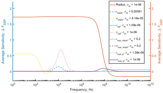 To determine the sensitivity, a MATLAB model was developed to calculate between 1 Hz and Hz for a given set of electrical model cell parameters. Values for were calculated for a 10% increase of permittivity and a 100% increase of conductivity for each compartment over 10 equally spaced intervals, for example, or . The average of these changes at each frequency was calculated to determine the sensitivity as a function of frequency for each parameter.