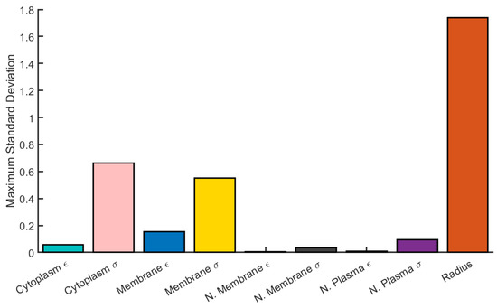 The largest change in the DEP force is due to variation in cell radius, with other parameters contributing significantly less (by approximately a factor of 2) to the overall variation. The maximum average variation across all frequencies was considered as well (Figure 2) and shows similar results.