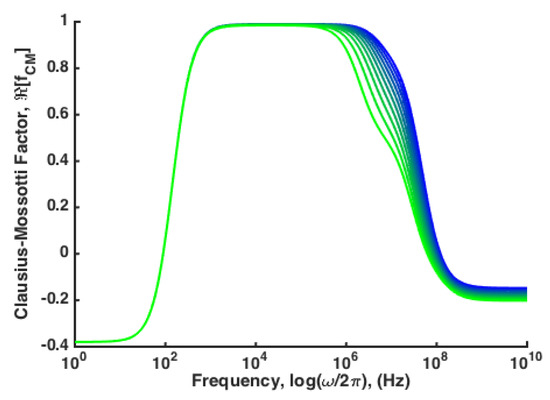 where is the electrical permittivity, is the electrical conductivity, and is the frequency of the applied electric field in radians/second. varies from −0.5 to 1.0; the point where is termed the “cross-over frequency” and here notated as . The approximations that lead to Equation (6) should be carefully examined for a given application: