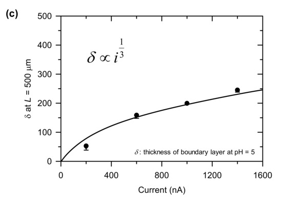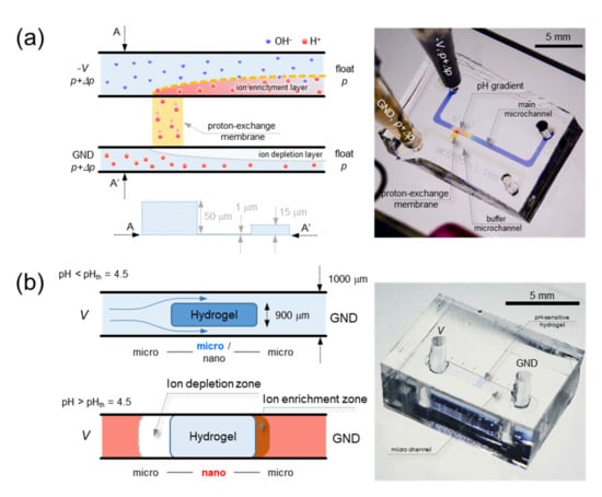 However, in this work, we studied how to utilize the inevitable pH changes for useful applications instead of avoiding the pH changes. Adjusting current means controlling the amount of proton transport through proton-exchange membrane, thus, pH value at the proton-receiving side of the membrane can be precisely manipulated (Figure 1a). Note that the proton-receiving side is also known as the ion enrichment zone where electrical conductivity increases so that the analysis about complex electroconvection [42,43,44] is unnecessary in this work. Combined with laminar flow and diffusion characteristics, we could demonstrate the generation of tunable pH gradient as well. Another useful scheme is a sensor using the impact of pH on the electric current with pH-responsive hydrogel. It can significantly change its volume in the response of small alterations of surrounding pH. When the hydrogel swelled inside a microchannel to block it, the microchannel became micro-nano-micro channel structure so that ICP occurred and the electric current dropped significantly (Figure 1b). The results shown in this work were able to demonstrate a phenomenological application. Thus, this concept could be a potential basis for further investigation of the pH utilization. If further developed, one can apply the tunable pH gradient generation for pH stimulation in local area of biomolecules such as muscle cell and the current changes due to pH for the portable pH sensor using pH-sensitive hydrogel, etc.
