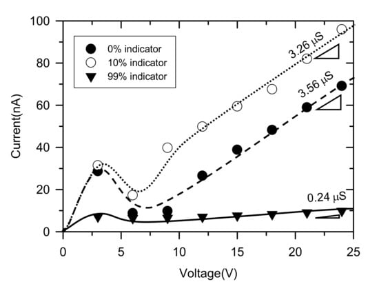 For the preliminary test of universal pH indicator’s concentration, the current-voltage characteristics were measured through the Ag/AgCl electrode. Current-voltage responses were driven by a source measure unit (Keithley 236, Keithley Instruments, Cleveland, OH, USA) and recorded by the customized Labview program. An external voltage increased from 0 V to 25 V at 0.2 V/20 s. Note that it was reported that electrolysis is negligible in current values [47,48], while there must be a water dissociation into H+ and OH−. Furthermore, pH value is not changed if one uses sufficiently large surface area of electrodes [36].