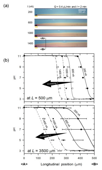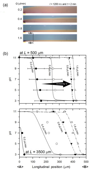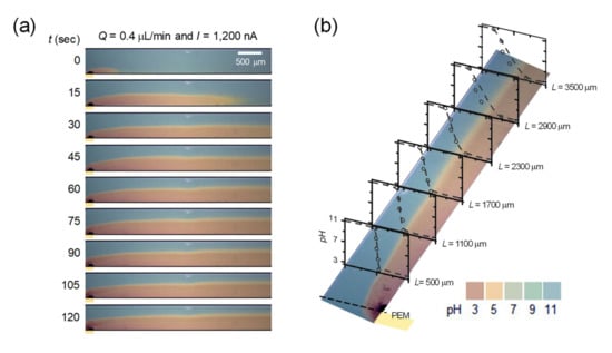 In the device shown in Figure 1a, 10 mM of NaOH (pH = 11) and 10 mM of HCl (pH = 3) were injected into the main and the buffer microchannel, respectively at the flow rate of 0.4 μL/min. In the meantime, external constant current of 1200 nA was applied through the proton-exchange membrane. 1200 nA was chosen just an example of good-looking presentation. Under these conditions, only H+ can be pumped into the main microchannel so that the pH gradient started to generate in longitudinal direction by diffusion. Thus, the color of solution in the main microchannel turned into reddish from the proton-exchange membrane. Since the Reynolds number in the main microchannel is around 0.1, one can expect a laminar flow regime in the channel as shown in Figure 3a. See the Supplementary Video S1. Furthermore, the sharp gradient near the membrane (see inset graph at L = 500 μm) gradually flatten along the transverse direction (see inset graph at L = 3500 μm) as shown in Figure 3b. Therefore, one can choose the shape of gradient at one’s discretion by placing a target object at desirable distances from the membrane.