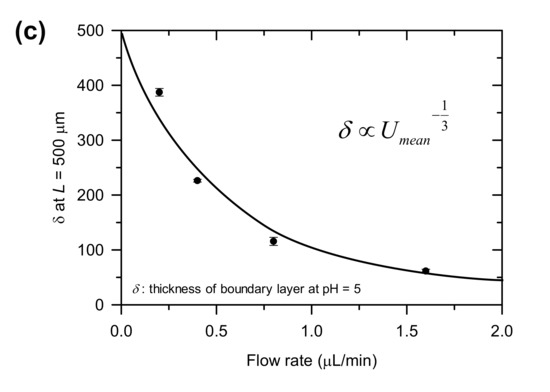 When the solution flew through the main microchannel with different external input flow rates, its pH profile redistributed as shown in Figure 5b. The interface between low and high pH shifted as flow rate varied. Figure 5c showed the relation between thickness of the boundary layer and flow rate. This could be explained by Sherwood number (Sh), where W is the half-width of the microchannel, Ln is the length of the nanoporous medium, Deff is effective diffusivity of analytes and Umean is the average velocity of external flow [50]. Since the boundary layer thickness, δ can be expressed as under these conditions, one finally got the relation as δ ∝Umean−1/3. This relation confirmed in Figure 5c. Note that δ in Figure 5c is the thickness of boundary layer where pH = 5.