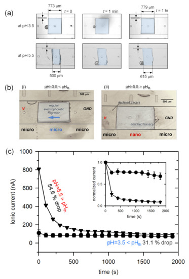 Another fingerprint of ICP is I-t response. Due to the formation of ion depletion zone which has extremely high electrical resistance [52,53,54], the initial current should sharply drop as a function of time. These changes were measured as shown in Figure 6c. A constant voltage of 10 V was applied in both pH conditions. The current dropped immediately after the application of voltage in the case of pH = 5.5. Comparing to the initial value, it dropped 84.6% after 2000 s. Otherwise, it slightly dropped from its initial value (31.1% drop). The reason why it slightly dropped in case of pH = 3.5 was that ICP also formed when a micro- and a nano-junction coexist in parallel [55,56,57,58]. While one expects a higher initial current in a micro-micro-micro-connection than one in a micro-nano-micro-connection by considering cross-sectional area, it involves complex interactions such as Donnan concentration of nanoporous material [51,59], surface charge of microchannel [13], the concentration of electrolyte (i.e., Debye length) [2,55], and the transversal dimension of hydrogel itself, etc. Thus, normalized current values with respect to each initial current value were plotted in the inset of Figure 6c. If further developed (e.g., multiplexed design with hydrogels that react multiple pH values), one can utilize this scheme for a simple pH meter.