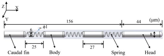 Inspired by natural swimmers that swim with high efficiency and speed utilizing undulatory locomotion [25,26,27,28,29], the microswimmer was designed with multiple cylinders connected through springs to mimic the travelling-wave moment. The applied spring in the microswimmer can undergo flexible deformation under an external magnetic field to lead to the mechanical bending of the swimmer. The body and caudal fin in the design were used to break the symmetry in order to achieve net propulsion in the low Reynolds number environment. Under a periodic oscillating magnetic field, the magnetic head of the swimmer bends upward and downward regularly to achieve undulatory locomotion, propelling the swimmer forward. The overall length and diameter of the microswimmer are 200 and 8 μm, respectively, while the length, diameter, and wire diameter of the spring are 25, 6, and 1 μm, respectively, as shown in Figure 1 (a detailed justification of the design size of the microswimmer is provided in Appendix A). The head of the microswimmer is of a longer length compared with the other segments to obtain increased magnetization, creating a stronger magnetic torque exerted on the head [27]. The swimming direction of the microswimmer depends on the interaction between the head segment and the external magnetic field, where the head segment is magnetized along with the applied magnetic field. Therefore, the swimming direction can be altered by changing the direction of the magnetic field.