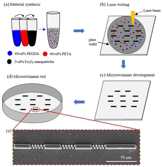 Figure 2 shows the fabrication process of the microswimmer. The material preparation was first conducted, as shown in Figure 2a. The materials chosen are PEG-DA, a US FDA approved food-based polymer that has been shown to be safe for use inside the body, and PE-TA to increase mechanical strength [32]. These two materials allow the microswimmer to be biodegradable while still maintaining sufficient structural integrity. The optimum ratio used is 49% PEGDA and 49% PETA, together with superparamagnetic Fe3O4 nanoparticles blended in for magnetic actuation. Following the laser writing process, the prepared materials were dropped in a transparent glass wafer and the microswimmers directly printed by a laser beam, as shown in Figure 2b. After that, the glass wafer with the structures was fixed vertically in a 25 mL beaker filled with a bath of toluene substrate holder for 5 min to remove the unpolymerized photoresist, as shown in Figure 2c. Afterwards, the substrate holder was pulled out from toluene bath and placed in another beaker with iso-propanol for about 2 min. The substrate was then gently blown dry with nitrogen. Finally, Figure 2d shows that the prepared microswimmers were transferred to a chamber for swimming test. Figure 2e shows the scanning electron microscopy (SEM) images of the microswimmer. The efficiency of the release procedure for successful swimmers is more than 80%. Most of the loss occurred during the developing process, where chemical fluids used to remove unpolymerized photoresist may also remove parts of the structure.