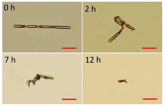 Degradability of the fabricated microswimmer was first tested. The components in the materials used to fabricate the swimmer have ester chemical bonds that could be slowly cleaved by water. As the components cleaved, the incorporated magnetic nanoparticles are released, and all the degraded product can be metabolized or circulated outside the body. To effectively demonstrate degradability of the microswimmers, the microswimmers were tested in sodium hydroxide (1 mol/L) of pH 14 environment for fast cleave of the chemical bonds. Aqueous sodium hydroxide was used to promote hydrolysis, which is also known as saponification [36]. The fabricated microswimmer was totally broken down in few hours, as shown in Figure 3, indicating that the microswimmers can be degraded in water environment for potential in vivo medical applications.