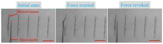 Maintaining a high level of structural integrity is a design objective of this microswimmer, hence the structural robustness test of the microswimmer was also conducted. A laboratory-designed microoperation system with a microneedle [37] was used to stir the microswimmer, which was adhered to the glass substrate. Force was applied to deform the middle sections connected with springs, and, when the force was revoked, the microswimmer was able to revert to its initial state, as shown in Figure 4 (Video S1). This test demonstrates that the microswimmer possesses the capacity of maintaining strong structural integrity, making structural collapse during operation unlikely. After all washing and release procedures were completed, microswimmers remained almost full integrity.