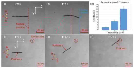 Free-swimming experiments of guiding the microswimmer to a desired site through sub-paths of a–b and b–c was also conducted, as shown in Figure 5d–f (Video S3). At the beginning position a, the microswimmer was swimming forward along positive x-axis, before changing its swimming direction from horizontal to up-left direction at position b to agree with the direction of external magnetic field. Finally, the microswimmer was moving along up-left direction to the marked desired site via undulatory locomotion. This experiment indicated that the microswimmer can be well controlled along with guided directions via external magnetic field in the low Re regime. Free-swimming experiments of the microswimmers with other different sizes were also conducted, and the explanation and results are provided in Appendix A and Videos S4 and S5.