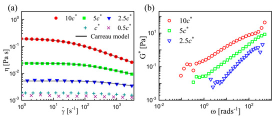 The rheological properties of PEO solutions were measured using a rotational rheometer with cone-plate (50 mm, 0.3 rad) (Physica MCR302, Anton Paar GmbH, Glaz, Austria). The viscosities η were measured at shear rates of 0.1–3000 s−1 (Figure 1a), and the complex moduli (G*) as a function of angular frequency (ω) was measured in dynamic oscillatory experiments with a constant strain of 4% (Figure 1b). All the measurements were conducted at 25 °C maintained by a Peltier stage. The shear-rate-dependent viscosities and the complex moduli indicate the coexistence of shear-thinning and elasticity. Meanwhile, both the shear-thinning and the elasticity enhance with the PEO concentration c.