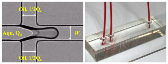 The flow-focusing configuration was employed in the present study, as shown in Figure 2. The main channel was 50 μm in both width and height (Wc). All the openings of the cross-slot structure were 50 μm. The intermediate inlet was set to introduce dispersed phase fluid. The two identical side openings are for continuous phases, which are then merged into one main inlet for easy control in actual operation. The chip was fabricated in polydimethylsiloxane (PDMS), based on the standard soft-lithography technique as described previously [48,49]. Before the experiments, the chips were kept in an oven at 80 °C overnight to restore the material to its native hydrophobic condition. The square geometry and the hydrophobic properties were designed to minimize the three-dimensional effect as far as possible, allowing us to rationally analyze the droplet generation process just from the in-plane images [35].