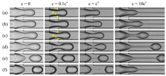 The image sequences listed in Figure 3 demonstrate the thinning processes of the dispersed thread for different polymer solutions under the identical flow condition, i.e., q = 4 and Qc = 40 μL/h. The case of pure water, i.e., c = 0, exhibits typical filament thinning and droplet generation of Newtonian fluid. Initially, the dispersed thread starts to elongate and neck after it is driven into the junction. The thread then thins quickly and forms a primary droplet connected to a thin filament. The thin filament finally breaks into a satellite droplet. To simplify the analysis, the breakup time tb is defined as the instant when the filament is uniform and the satellite droplets have not yet formed, as shown in Figure 3e. These observations are consistent with previous experiments [31,37,50].