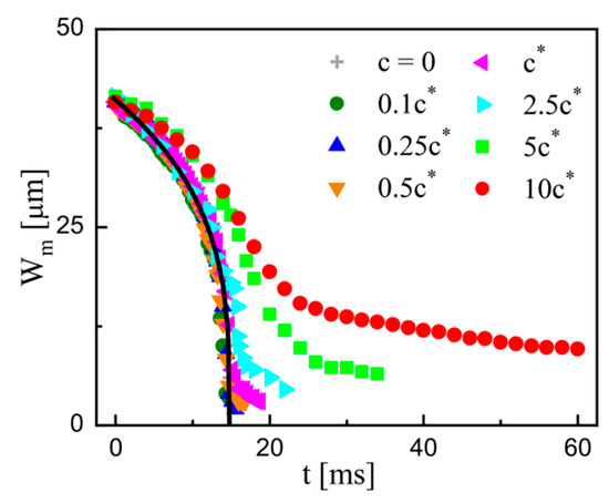 Figure 4 shows the typical results of time-varied Wm under different conditions. The measured data are truncated at the breakup time tb when the width thread is uniform, and the satellite droplets have not formed yet. The result of pure water (c = 0) is provided as the Newtonian counterpart. As shown by the black solid curve in Figure 4, the power-law fit Wm ~ (14.8 − t)0.32 is consistent with previous microscopic experiments with Newtonian fluids [37,50]. In contrast, the polymeric cases display a different behavior. The decay is similar to that of the Newtonian counterpart in the early stages but deviates upwards later. The deviation enhances with the increasing concentration c, and the breakup time tb increases. Moreover, the retardation of decay in the early stage can be noticed when the polymer concentration c increases to the semi-dilute regime (c > c*). This retardation also shows a positive dependence on the polymer concentration c. This will be further explained in combination with the fitting law in the next section.