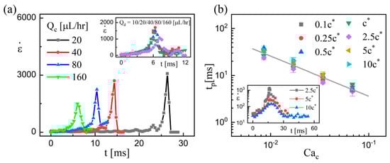 (a) Extensional strain rate as functions of the elapsed time at different Qc. The moment when the maximum occurs is regarded as the transition time tp. The PEO concentration c = c*. Inset: The time-varied at different Qd. (b) Values of transition time tp as functions of capillary number Cac. The straight line tp ~ Cac−0.86 is the best fit, and the error bars represent standard deviations. Inset: The time-varied at different c.