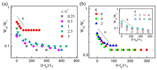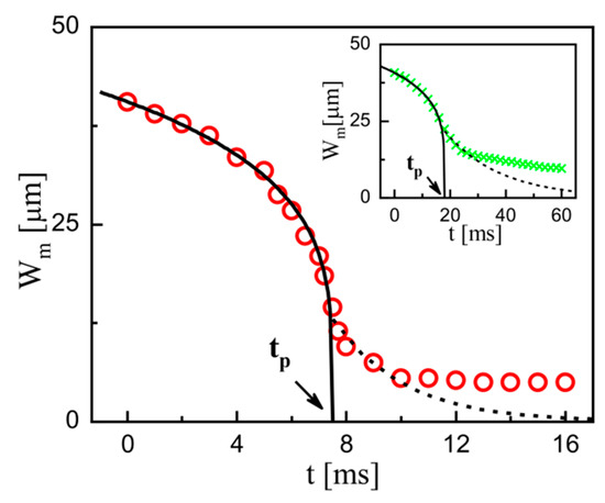 It is obvious that the filament thinning can be divided into two regimes based on the transition time tp for all the examined PEO solutions (Figure 4). This two-stage feature is the same to the previous experiments for purely elastic fluids, in which a power-law function along with an exponential function are often used to fit the thinning process [30,33,43,44,53]. It is widely acknowledged that the power-law function characterizes the flow-driven regime, while the exponential function characterizes the capillary-driven regime in the viscoelastic cases. Here, a combination of the two functions is also tried to fit our measured data for the semi-dilute solutions. Figure 6 shows the typical fitting of the time-varied profile of Wm at c = 2.5c*, in which Wm ~ (tp − t)0.24 and Wm ~ exp[−0.39(t − tp)] are separately denoted by the solid and dotted curves. For a denser solution (c = 10c*), the similar fit can be obtained (see inset in Figure 6). These results demonstrate that the combination of flow-driven regime and capillary-driven regime is applicable for all the examined PEO solutions. To unveil the potential effects of the other properties in semi-dilute polymer solutions, the two regimes are separately analyzed in detail.
