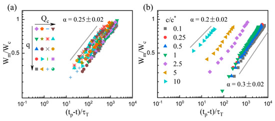 Plots of the dimensionless minimum width Wm/Wc of the dispersed filament to the dimensionless remaining time (tp − t)/τT for c = 2.5c* under different flow conditions (a) and for different concentrations (b). In (a), q = 1–16 and Qc = 20–160 μL/h. In (b), q = 2 and Qc = 40 μL/h. All grey lines are provided to guide the eye.