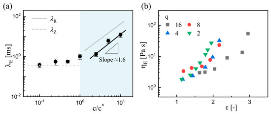Figure 9a shows the estimated values of extensional relaxation time λE for all the examined solutions. For the dilute solutions, i.e., c ≤ c*, the λE values are several times greater than the Zimm relaxation time λZ (dotted line in Figure 9a), which agrees with the findings of previous similar experiments [33]. Due to the microchannel confinements and the continuous phase flow, these estimated λE values are generally smaller than those captured in the pinch-off experiments of free surface fluid [33,43,44]. For the semi-dilute solutions, i.e., c > c*, the estimated λE shows similar c-dependence (λE ~ c1.6) with the reptation time λR (λR ~ c1.5), while the λE values are obviously smaller than λR. These smaller λE values indicate the incomplete stretch of polymer molecules in the capillary-driven regime. This coincides with the result that the coil-stretch transition becomes milder for more concentrated polymer solutions in both macroscopic and microscopic extensional flows [44,55]. Moreover, the accumulated strain or Hencky strain ε can be calculated as ε = 2ln(W0/Wt), [35,52] where Wt denotes the time-varied Wm. It is thus found that the maximum strain εmax = [4.5–6] at c = 0.1c*, while εmax = [1–2] at c = 10c*. This contrast supports the claim of incomplete stretch in the semi-dilute solutions.