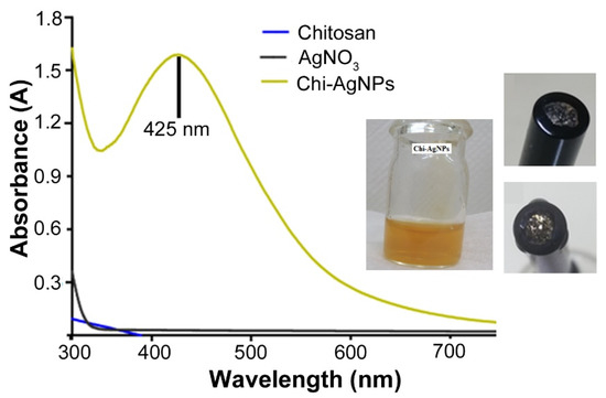The use of nature-derived biopolymers such as chitosan has received attention for the fabrication and stabilization of metal nanoparticles owing to biological and environmental safety and cost-effectiveness [37]. Metal nanoparticles that have been reduced/stabilized with biopolymers demonstrate higher stability against pH and electrolytes changes in comparison to their counterparts stabilized with synthetic or other small molecules [38]. In the current study, chitosan was employed as the reducing as well as a stabilizing agent for the synthesis of AgNPs. The facile, one-pot, aqueous synthesis process makes it green and scalable. UV-visible spectrophotometry is a reliable tool for confirming the synthesis of metal-based nanoparticles and was used. Chitosan and AgNO3 do not show characteristic peaks when screened over the range of 300–750 nm as shown in Figure 1. A single surface plasmon resonance is observed for Chi-AgNPs with peak height of 1.58 at 425 nm, which is a characteristic marker for the successful synthesis of AgNPs. The characteristic peak is narrow with good height, indicating synthesis of chitosan stabilized AgNPs with a tight size distribution.