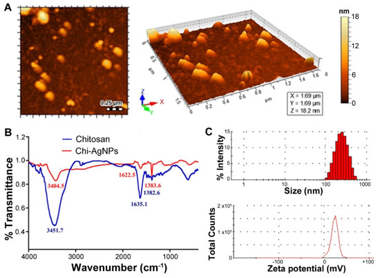 The synthesized chitosan stabilized AgNPs were then characterized for their size, polydispersity index (PDI), zeta potential, and surface morphology. AFM imaging shows the spherical morphology of the synthesized AgNPs as seen in Figure 2A. The FT-IR spectrum of chitosan reveals a characteristic peak of N-H stretching merged with O-H absorption at 3451.7 cm−1. Similarly, the N-H group bending vibration appears at 1635.1 cm−1 as shown in Figure 2B [39]. The spectrum for Chi-AgNPs shows that the N-H stretching of chitosan shifts to lower frequency of 3404.5 cm−1, whereas the amino group bending vibration shifts to 1622.5 cm−1. These findings suggest the involvement of the amino groups of chitosan for the reduction/stabilization of AgNPs, confirming the attachment of chitosan to the nanoparticle surfaces.