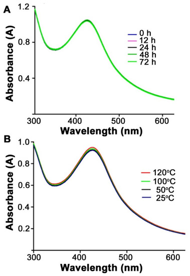 The synthesized Chi-AgNPs were investigated for their storage stability up to 72 h. The nanoparticle solution was stored at room temperature and its characteristic surface plasmon resonance was measured through UV-vis spectrophotometry at different time intervals (Figure 3). No aggregation was observed over 72 h and the particles retained their morphology and surface characteristics. Their characteristic surface plasmon resonance did not change up to 72 h upon storage, thus demonstrating they are highly stable. In order to consider their use for a robust biosensor, their stability to high temperatures was measured. The Chi-AgNPs were heated and their characteristic surface plasmon resonance was read through UV-vis spectrophotometer over a 25–120 °C range. When subjected to heat stability, the synthesized Chi-AgNPs were found stable even up to 100 °C. Around 120 °C, their characteristic surface plasmon resonance only slightly increased without any deviation as shown in Figure 3. This provides a major advantage of using this system for biosensing in comparison to the relatively fragile and expensive aptamers, enzymes, or antibodies typically used.