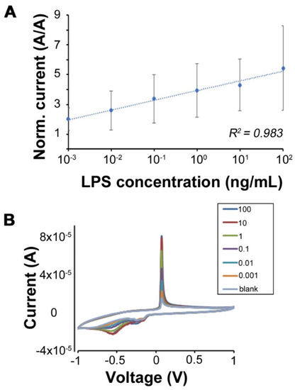 The modified electrodes were first dipped in PBS until the signal was stable (there was no change in the current response of the modified electrode after 45 min; the current remained stable). The stable sensing electrodes were then used for detection of LPS at a concentration range of 0.001–100 ng/mL. The current response of the sensing electrode increased along the increasing concentration of LPS in PBS as shown in Figure 4 (Figure S4 shows the electrode response in the absence and presence of LPS). It is important to note that a steady sensor response was obtained on the order of a few minutes, which is comparable to other reports for electrochemical biosensors. A calibration curve was constructed for the tested LPS concentration against the respective current response. The line was fit with an R2 value of 0.98, indicating a clear linear relationship between the change in current and the tested LPS concentrations over several orders of magnitude. Based on ICH guidelines, the limits of detection (LOD) and quantitation (LOQ) were estimated from the linear regression of the calibration curve. The LOD is the lowest concentration of the analyte in a sample that can be detected, but not necessarily quantified, under the stated conditions of the test. In comparison, the LOQ is the lowest concentration of the analyte in a sample that can be determined with acceptable precision and accuracy under the stated conditions of the test [42]. The LOD of the biosensor is ~0.001 ng/mL, which is extremely competitive in comparison to recent reports on LPS biosensors [10]. The LOQ of the biosensor is ~0.003 ng/mL. The current response for 100 ng/mL further validates the efficiency of the modified electrode to detect LPS over a wide range.