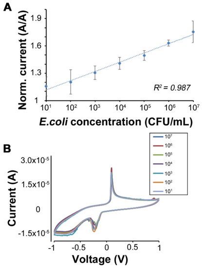 Cyclic voltammetry (CV) was carried out to characterize the biosensor and for electrochemical detection of both LPS and E. coli. Scanning was carried out from −1 to 1 V at 50 mV·s−1. For electrochemical analysis, a solution of LPS and suspension of E. coli were prepared in PBS. Bare GCE or Chi-AgNP modified GCE (sensing electrode) were immersed in PBS and their cyclic voltammograms were recorded as reference CVs for analysis. For the detection of LPS, a stock solution was prepared in 1× PBS with serial dilutions of 0.001–100 ng/mL used for further electrochemical detection. Similarly, E. coli serial dilutions were prepared in 1× PBS at 10–107 CFU/mL from freshly grown bacteria followed by electrochemical detection. Current signals for sensing experiments were normalized to their values with respect current signals of modified electrode in the absence of any LPS or E. coli concentration.