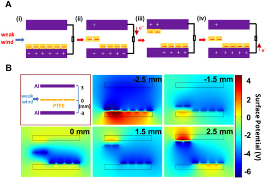 Figure 2. (A) Working mechanism of the wind-TENG (B) Finite-element simulation of the surface potential variation for wind-TENG.